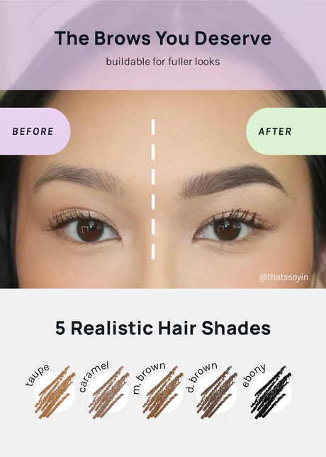 For best results, twist the pencil to reveal only a tiny bit of lead, then apply color with light pressure, as if you were sketching hair strokes. Comb through with the spoolie attached to the pencil!